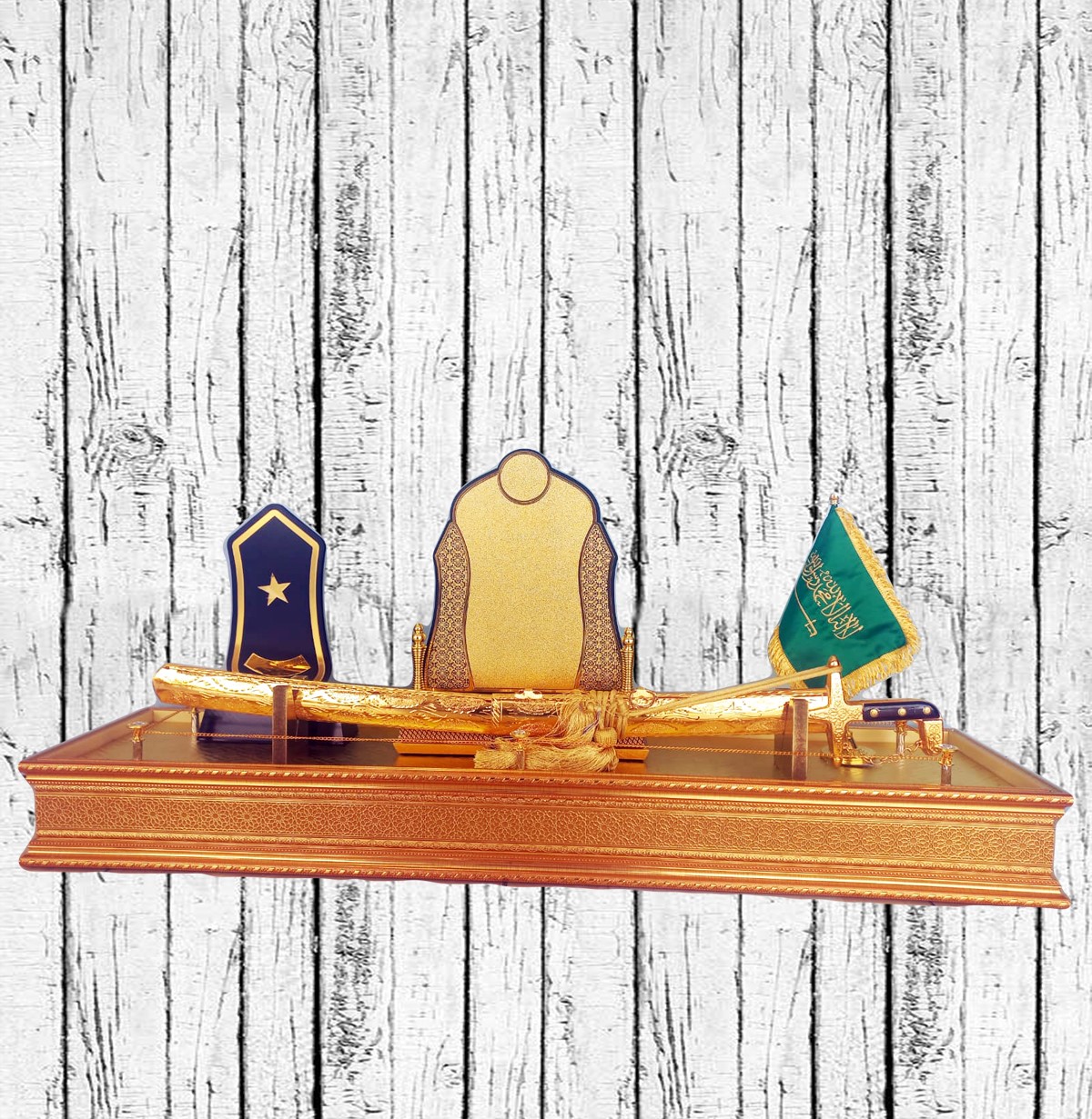 – يمكن تخصيص الدرع والنقوش على السيف مع إضافة اسم المكرم، التاريخ، والإنجازات التي يتم تكريمه من أجلها. يمكن أن يتم نقش هذا التخصيص على سطح الدرع أو السيف ذاته.